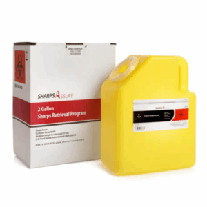 • 1 specially designed yellow sharps container (9″ L x 5.5″ W x 7.3″ H)